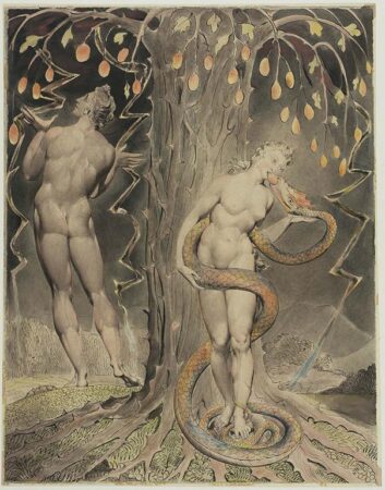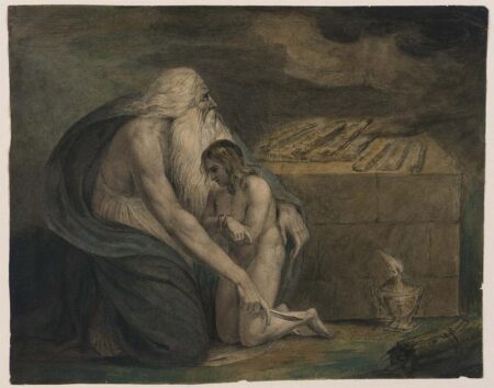 From a young age, Blake was subject to intense spiritual “visions,” and was deeply religious and reverent of the Bible throughout his life. At 16, his first original engraving, “Joseph of Arimathea Among the Rocks of Albion,” was biblically inspired, and his ink studies of The Book of Job date back to as early as 1786, when he was 29 (Blake would complete his illustrations of The Book of Job much later, in 1806, at the request of his patron Thomas Butts). Many of his biblical illustrations have affinities with traditional fan art due to his lifelong fascination with the Bible, and his drive to give visual life to its stories and characters for others.
