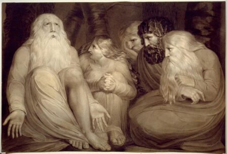 The same goes for Blake’s illustrations of Shakespeare. One of Blake’s best-known illustrations is “Pity,” which was not commissioned and was inspired by a famous line from Macbeth: “And pity, like a naked new-born babe, / Striding the blast, or heaven’s cherubim, hors’d, / Upon the sightless couriers of the air.” A little-known fact, though, is that Blake had drawn characters from Shakespeare’s plays when he was a young man. Around 1780, Blake painted a series of Shakespearian character studies that include Othello, Desdemona, Juliet, King Lear, Cordelia, Macbeth, and Lady Macbeth.